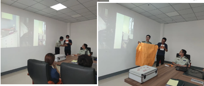 培訓(xùn)過程中,防火中心工作人員詳細(xì)的介紹了滅火毯、消防過濾式自救呼吸器、帶聲光報(bào)警功能的強(qiáng)光手電等消防器材的用途和使用,并向公司員工現(xiàn)場(chǎng)展示其正確使用方法,讓大家對(duì)火災(zāi)和消防有了更深入的了解。