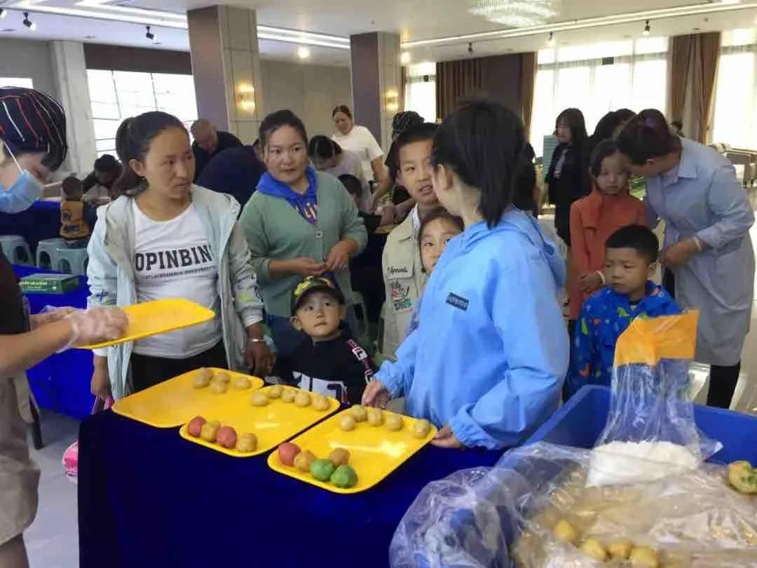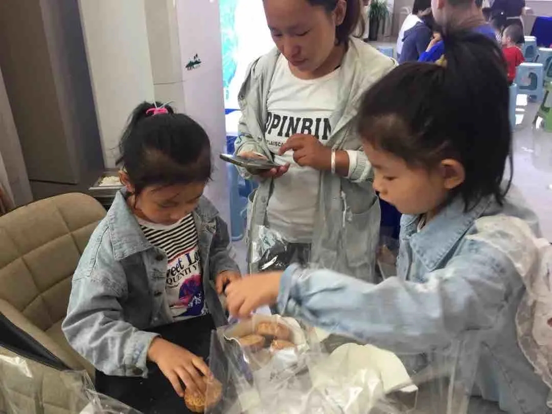 小朋友們排隊領取制作月餅的材料和模具