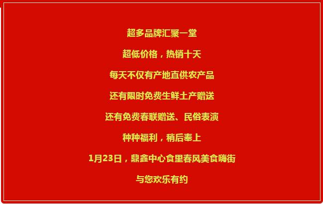 選對年貨,就相當(dāng)于年過好了一半。鼎鑫中心食里春風(fēng)美食嗨街為大家準(zhǔn)備了豐厚的年貨,綠色健康的產(chǎn)地直供農(nóng)產(chǎn)品,是我們?yōu)橄M(fèi)者送上的一份新春大禮包。