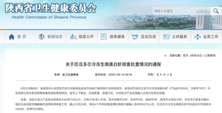 8月13日,陜西省疾控中心報告稱在對西安市蓮湖區(qū)方欣海鮮市場海鮮產品采樣核酸檢測中,發(fā)現一個批次的進口厄瓜多爾凍白蝦外包裝新冠病毒核酸檢測結果呈陽性。