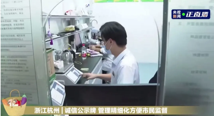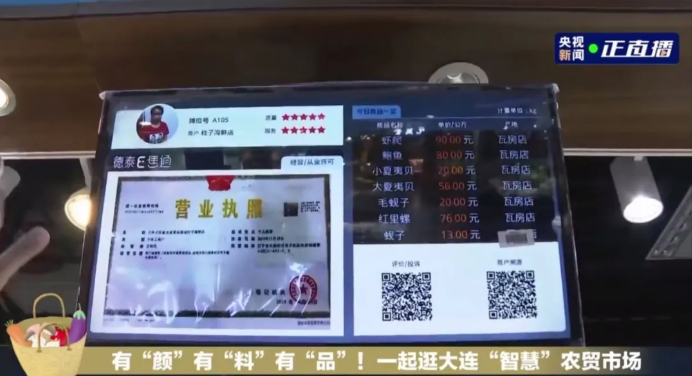 每個(gè)商戶的招牌下面都有一個(gè)屏幕,顯示著經(jīng)營業(yè)戶的營業(yè)執(zhí)照、食品類別、食品價(jià)格包括它的產(chǎn)地,一目了然,保證食品的品質(zhì)和安全。