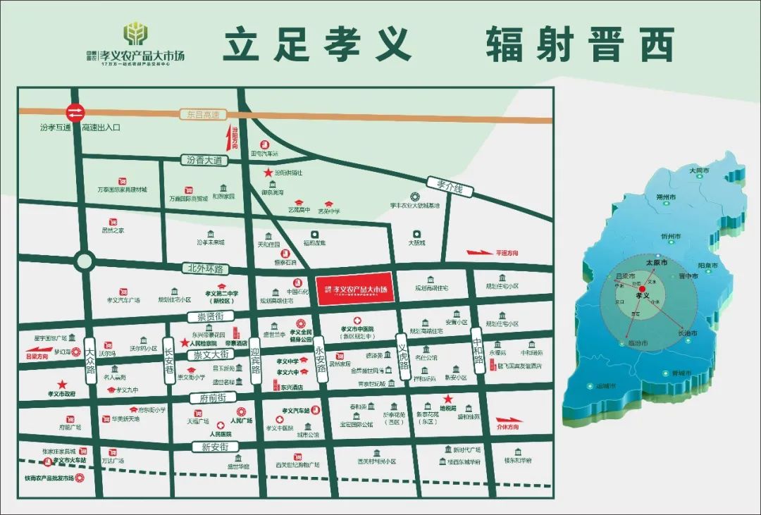 孝義農(nóng)產(chǎn)品大市場(chǎng)位于城市主干道永安路與崇賢街交匯處,項(xiàng)目總投資10億元,占地面積約220畝,總建筑面積約17萬(wàn)㎡,涵蓋蔬菜、水果、糧油副食、干貨調(diào)料、海鮮水產(chǎn)、冷凍鮮肉、日雜百貨、酒店用品八大業(yè)態(tài);農(nóng)特優(yōu)展銷區(qū)、商務(wù)辦公區(qū)、倉(cāng)儲(chǔ) 工區(qū)、冷鏈物流區(qū)、配套服務(wù)區(qū)六大功能區(qū)。項(xiàng)目建成后,將成為集農(nóng)產(chǎn)品展覽交易、電子商務(wù)、電子結(jié)算、加工配送、凈菜加工、冷鏈物流、質(zhì)量檢測(cè)、信息發(fā)布、創(chuàng)業(yè)孵化、金融服務(wù)、休閑娛樂等功能為一體的現(xiàn)代化大型農(nóng)批綜合服務(wù)平臺(tái)。