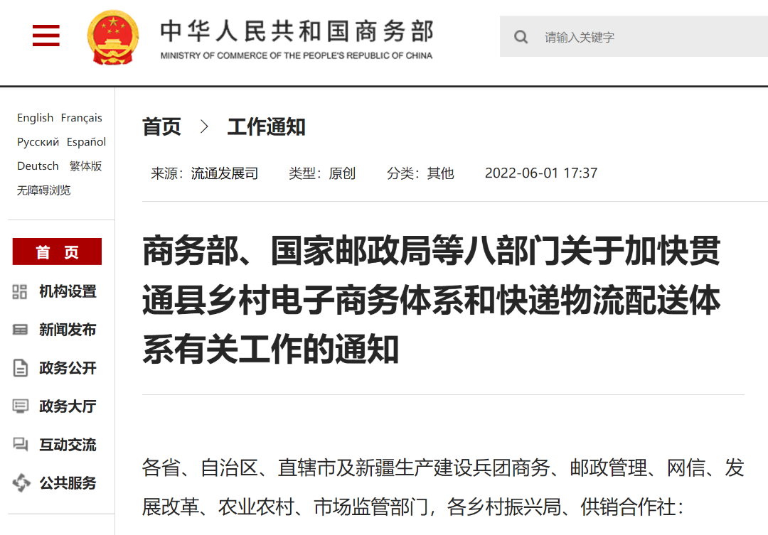 發(fā)展農(nóng)村電子商務和快遞物流配送是促進城鄉(xiāng)生產(chǎn)和消費有效銜接的重要舉措,是全面推進鄉(xiāng)村振興、構(gòu)建新發(fā)展格局的客觀要求。為認真貫徹落實黨中央、國務院決策部署,深入推進電子商務與快遞物流配送協(xié)同發(fā)展,加快貫通縣鄉(xiāng)村電子商務體系和快遞物流配送體系,現(xiàn)就有關工作通知如下。