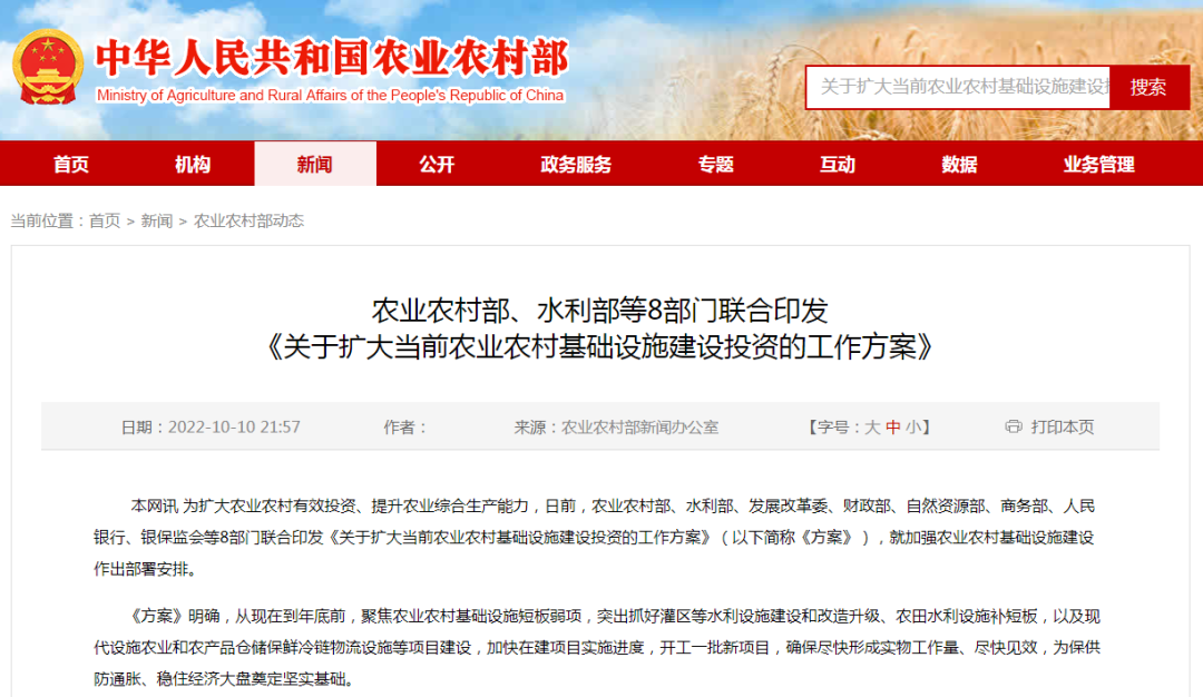 據(jù)農(nóng)業(yè)農(nóng)村部網(wǎng)站10日消息, 為擴(kuò)大農(nóng)業(yè)農(nóng)村有效投資、提升農(nóng)業(yè)綜合生產(chǎn)能力,日前,農(nóng)業(yè)農(nóng)村部、水利部、發(fā)展改革委、財(cái)政部、自然資源部、商務(wù)部、人民銀行、銀保監(jiān)會(huì)等八部門聯(lián)合印發(fā)《關(guān)于擴(kuò)大當(dāng)前農(nóng)業(yè)農(nóng)村基礎(chǔ)設(shè)施建設(shè)投資的工作方案》(以下簡稱《方案》),就加強(qiáng)農(nóng)業(yè)農(nóng)村基礎(chǔ)設(shè)施建設(shè)作出部署安排。