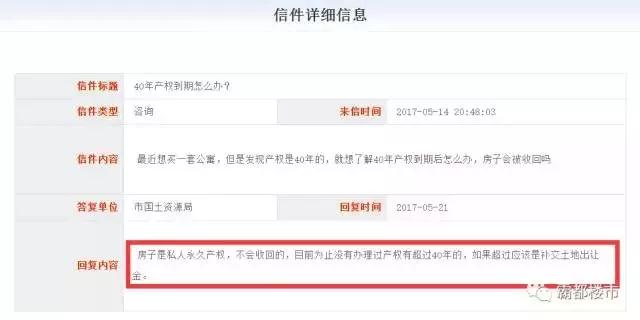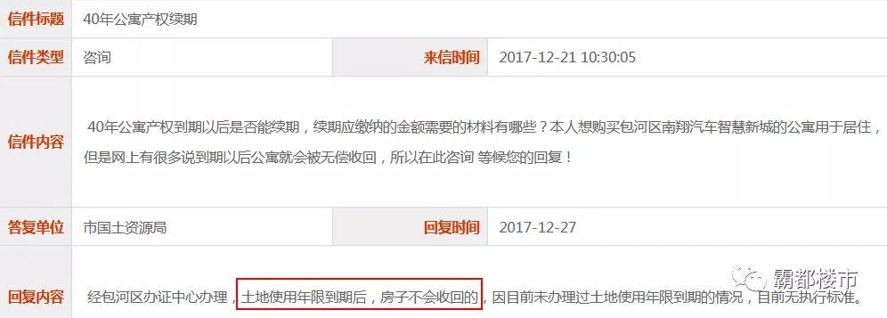今天,在合肥12345上,合肥市國土資源局回復(fù)有關(guān)“40年公寓產(chǎn)權(quán)到期”的問題,表示:產(chǎn)權(quán)到期,房子不會(huì)收回。