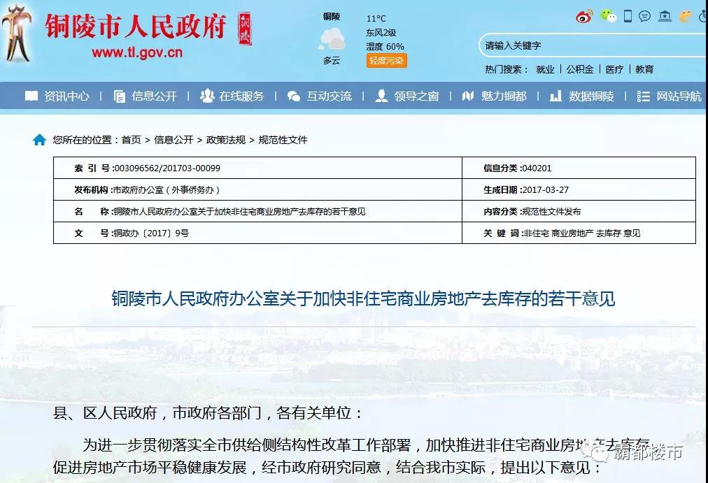 2017年3月27日,銅陵發(fā)布非住宅商業(yè)房地產(chǎn)去庫存新政。其中提出:激勵(lì)社會(huì)資本購買或租賃庫存非住宅商業(yè)房地產(chǎn),給予適度財(cái)政補(bǔ)貼。